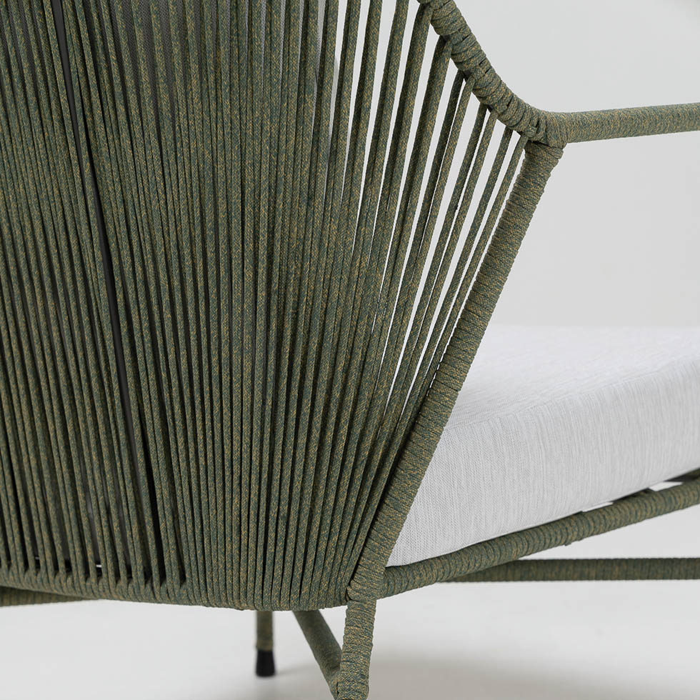 Il telaio in alluminio verniciato a polvere offre una struttura resistente e leggera, ideale per l’uso quotidiano e in ambienti esterni. Le corde, in olefin e polipropilene intrecciate a mano, garantiscono resistenza agli agenti atmosferici e una texture unica, piacevolissima al tatto.